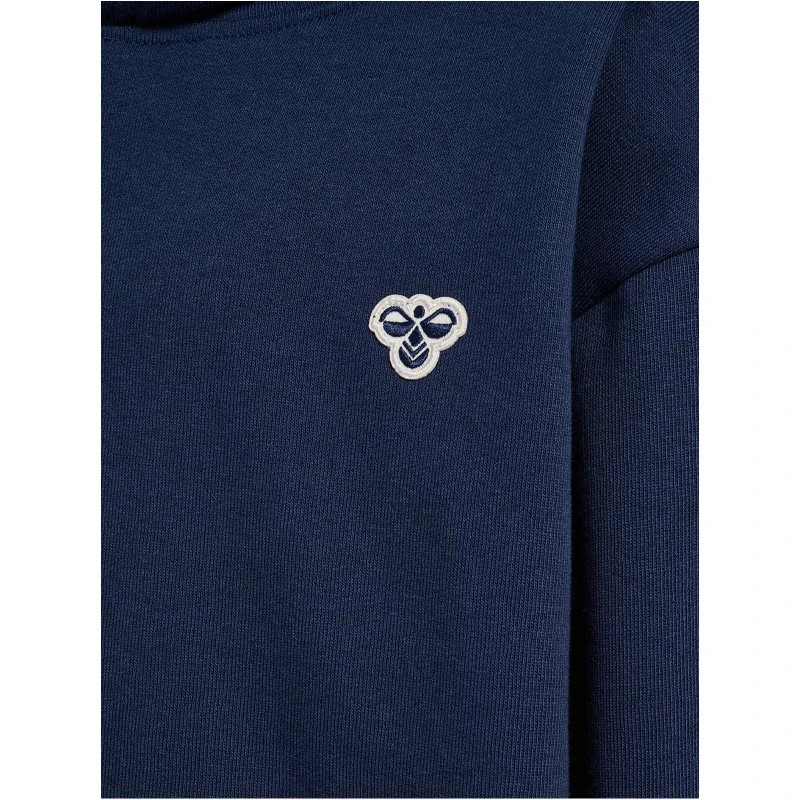 A hummel hmlJR Loose Bee kapucnis pulóver puha melegítőanyagból készült a kényelmes viselet érdekében. A klasszikus kapucnis fazon ejtett vállal, elöl kenguruzsebbel, bordázott mandzsettával és szegéllyel laza, lezser megjelenést kölcsönöz. A mellkason található kis hummel logós hímzés különleges hatást kelt.